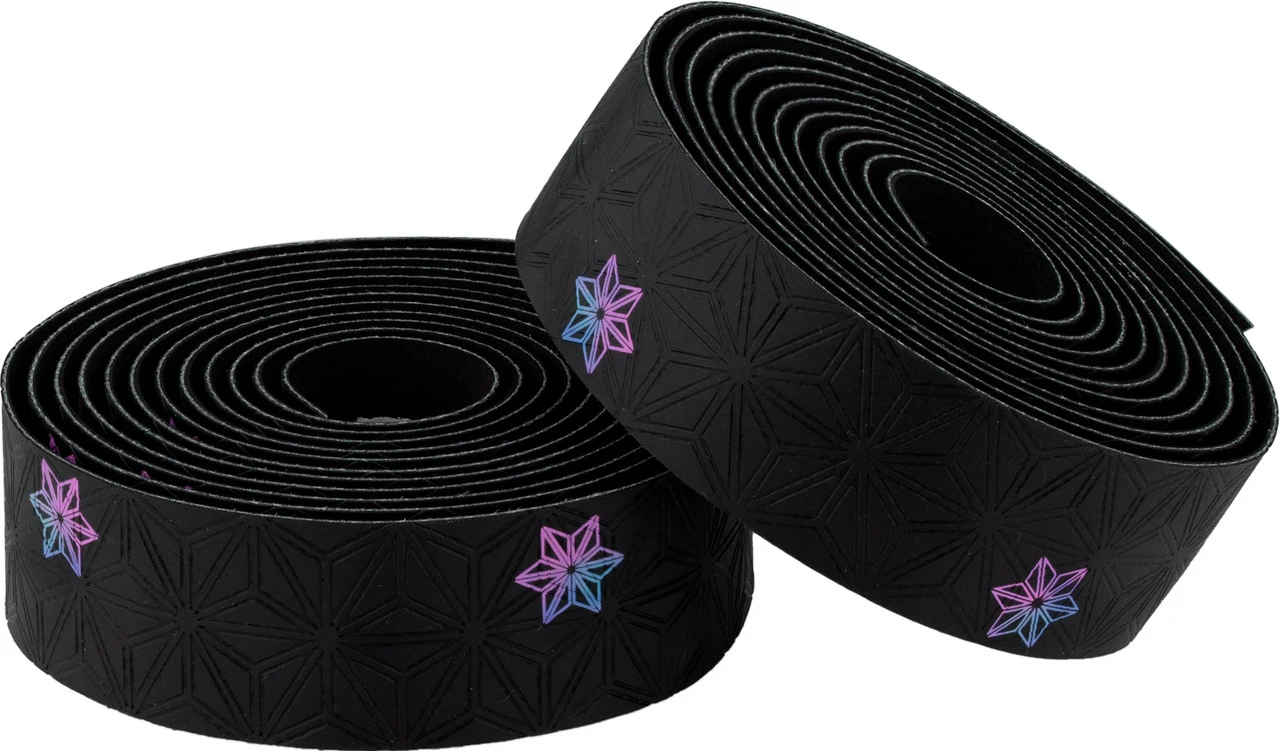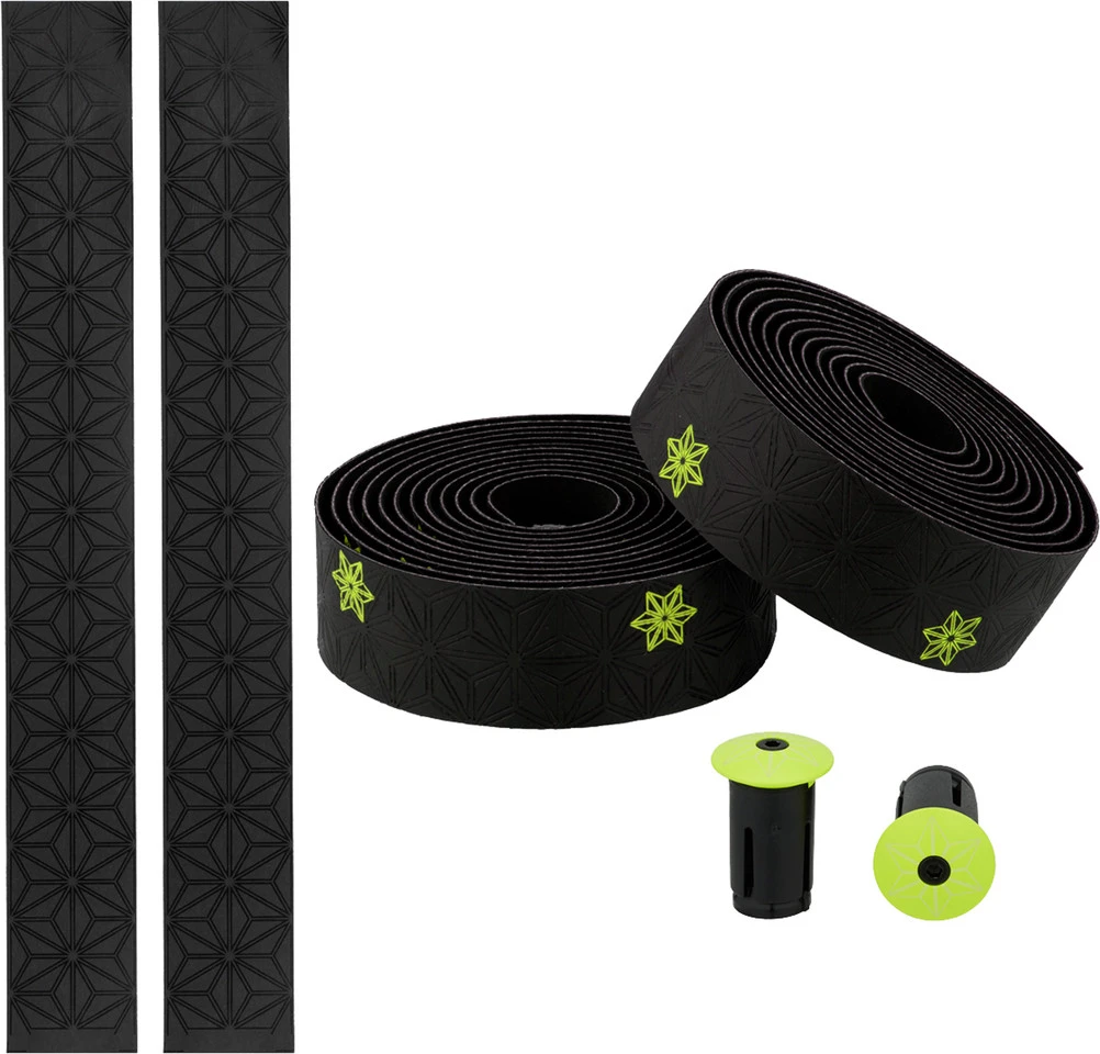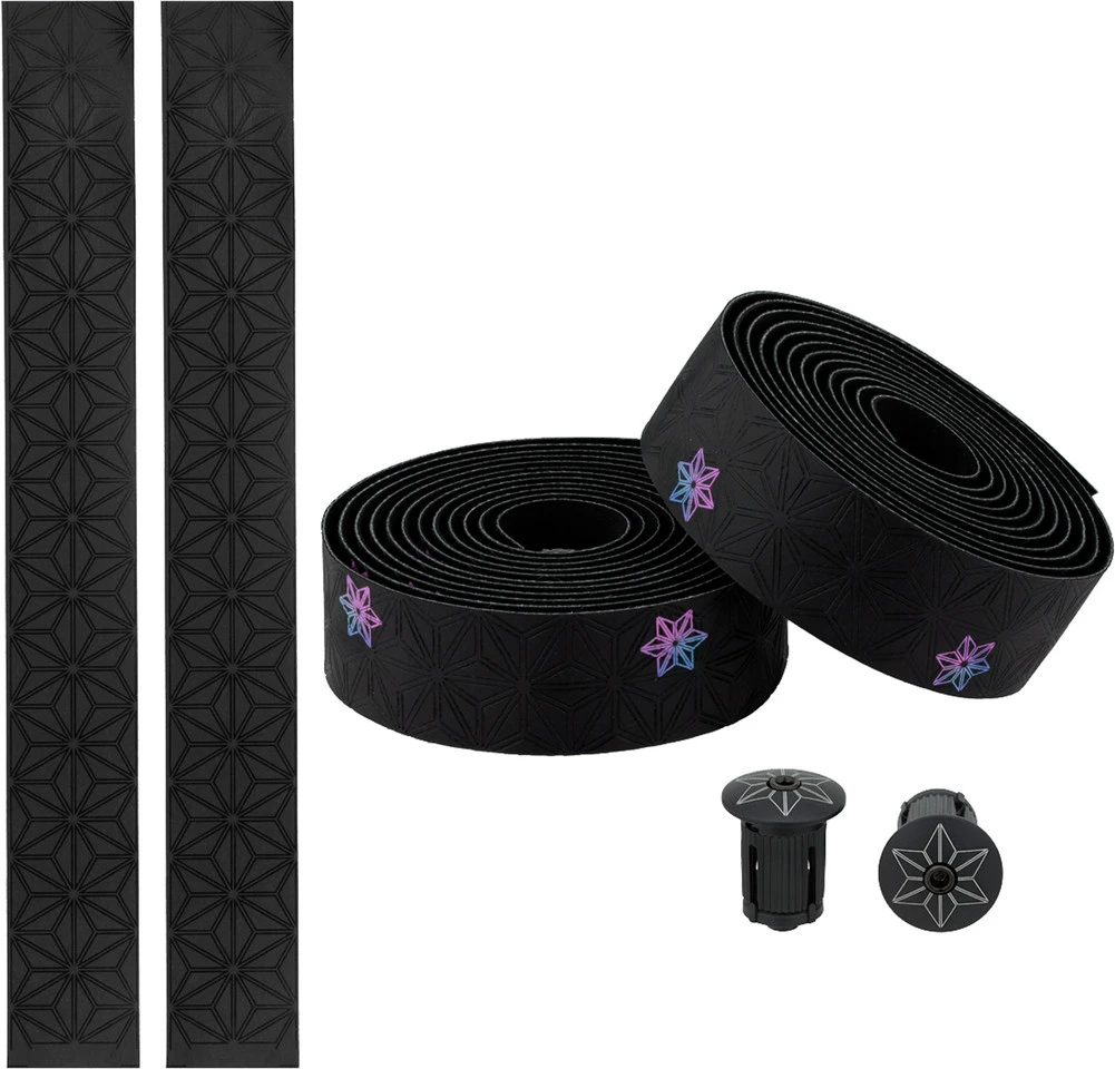 Herstellernummern:celeste:BT-78neon yellow:BT-27oil slick:BT-128red:BT-22white:BT-57Lieferumfang:1 Paar Lenkerbänder Supacaz Super Sticky Kush Galaxy1 Paar Lenkerendstopfen Supacaz1 Paar Abschlussbänder Supacaz